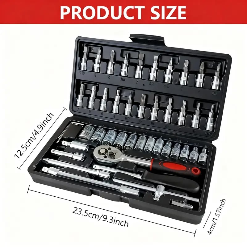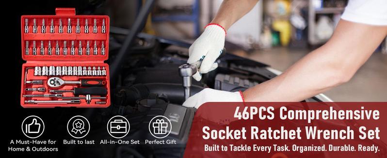 Tired of searching for the right wrench or losing small tools? This 46/53-piece socket ratchet wrench set keeps everything you need in one compact, well-organized case. From hex keys to sockets and extensions, it’s a complete kit that saves space and money—perfect for DIY lovers, car owners, and household repairs.